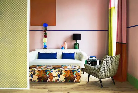 对称的房间布局和斑马条纹的地毯在方向上形成了一致,整齐而舒适感觉就出来了。浅黄色和墨绿色的搭档已经心照不宣了——温暖系列两兄弟。