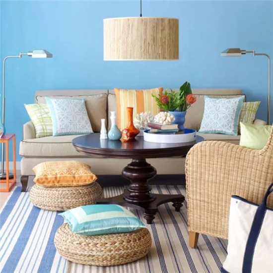 地中海民族风的客厅装修,家具都是白色的,搭配蓝白的软装,抢眼的沙发墙是梦幻的星空,仿古的灯具与风扇,色彩绚丽的同时透露出惊人的简洁。不用说了,设计师很厉害。