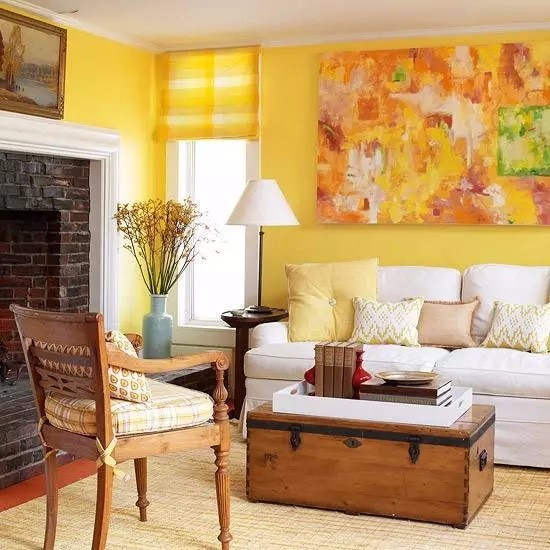 鲜黄色的阳光气息的墙面,白色的长沙发上用了活泼色彩的软装搭配。特别的棕色的木质地板,不仅色调压制住了过于轻狂的软饰,木头的纹路也丰富了客厅的味道,真的很漂亮。